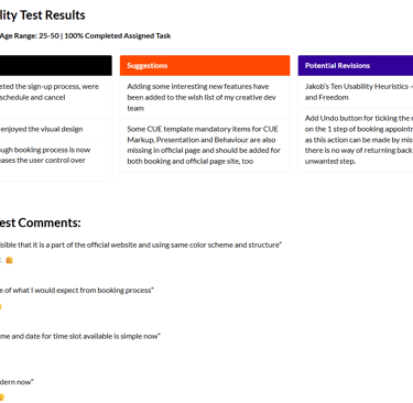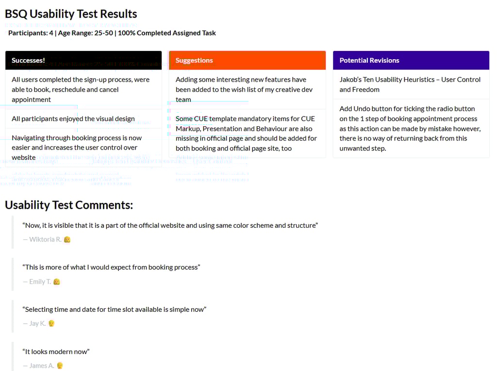 All participants were able to make the appointment easier and faster than using old system. Some design changes could be addressed if we are allowed to perform the bigger changes to the website breaking the current flow of the performing the booking.